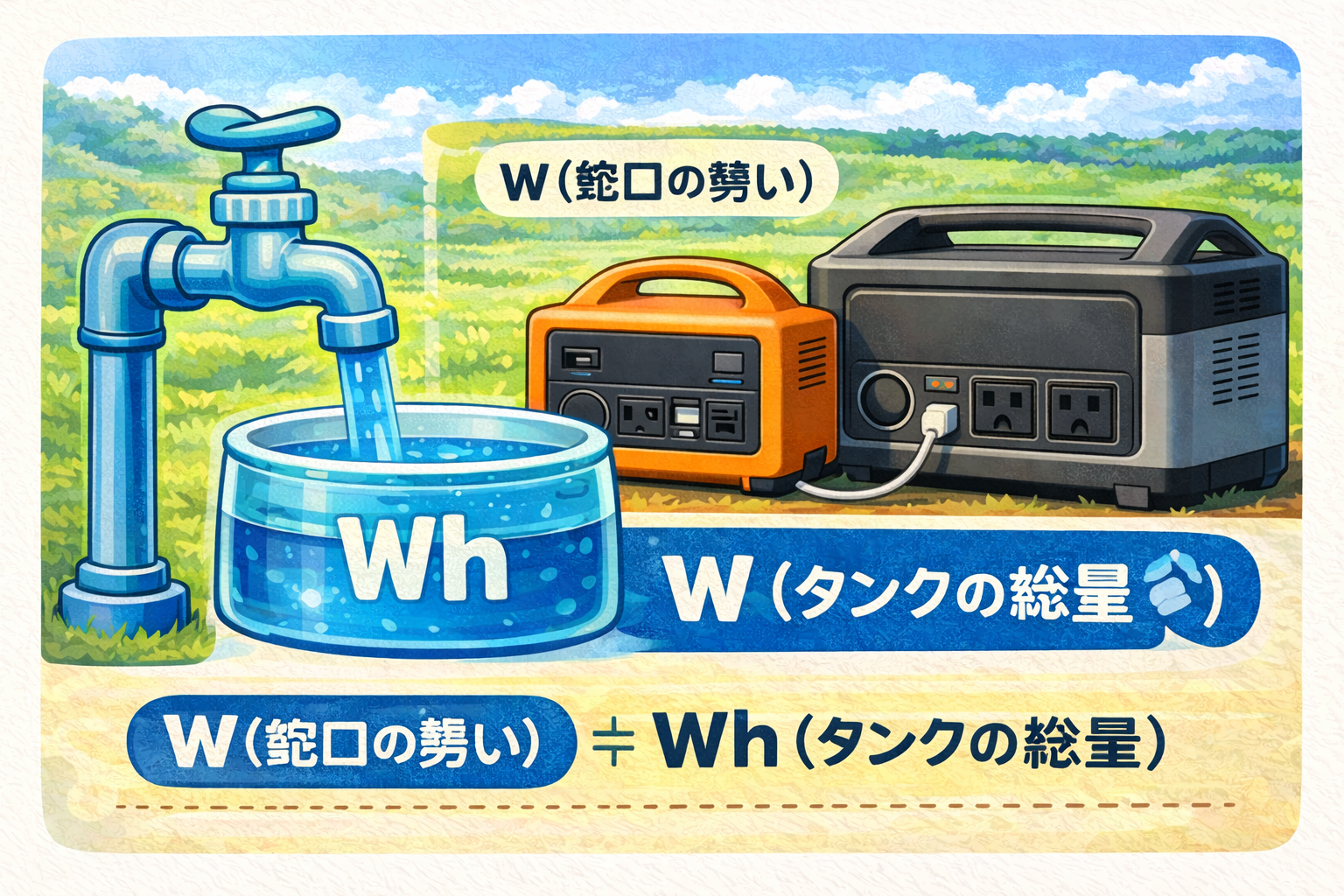 簡単なイメージで言うと、Wは「蛇口の水の勢い(流量)」、Whは「タンクに入っている水の総量」に似ています。蛇口を大きく開けるほど(Wが大きいほど)タンクは早く空になりますし、タンクが大きいほど(Whが大きいほど)長く使えます。