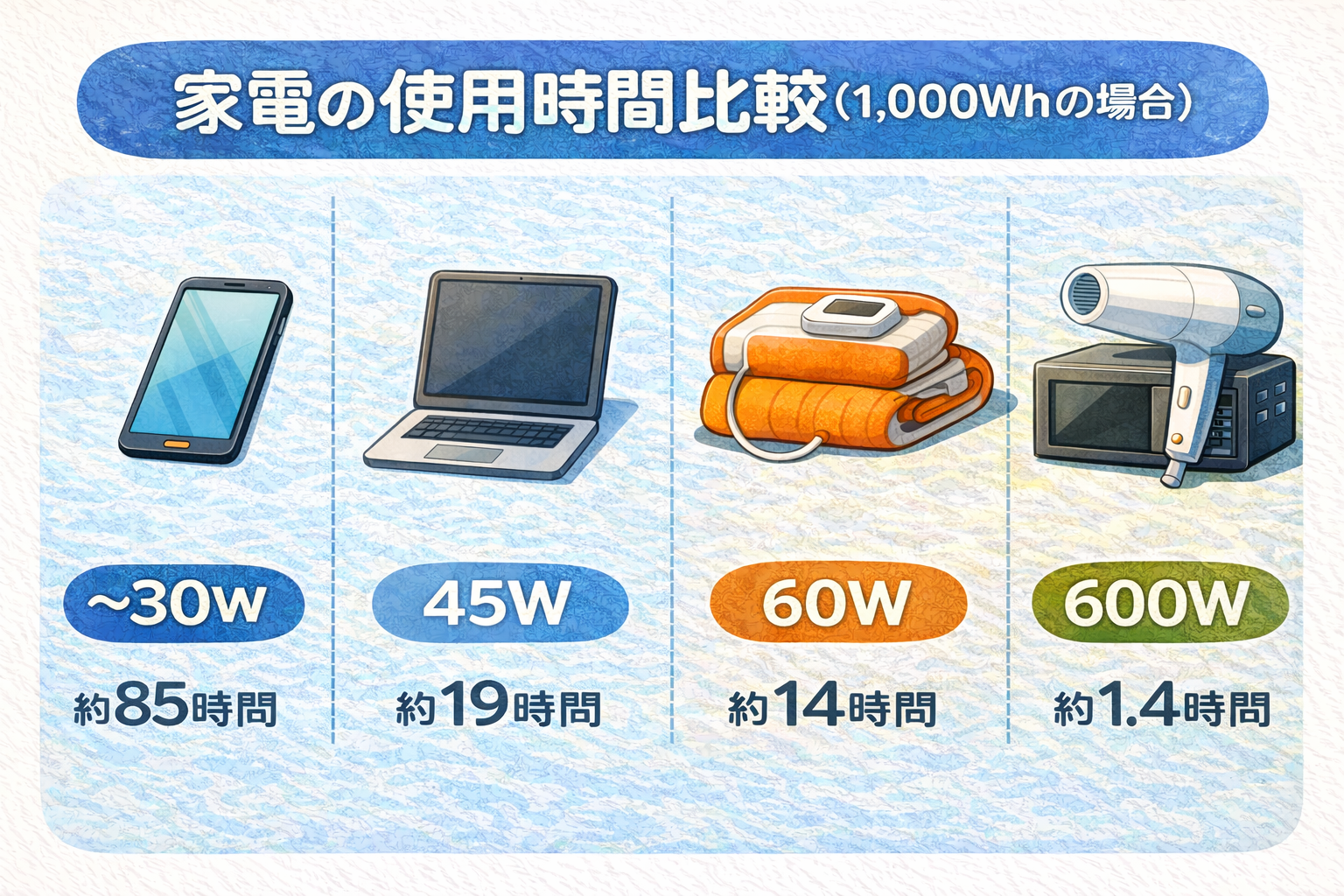 ※変換効率(約85%)を考慮すると:使用時間 ≒ 容量(Wh)× 0.85 ÷ 消費電力(W)