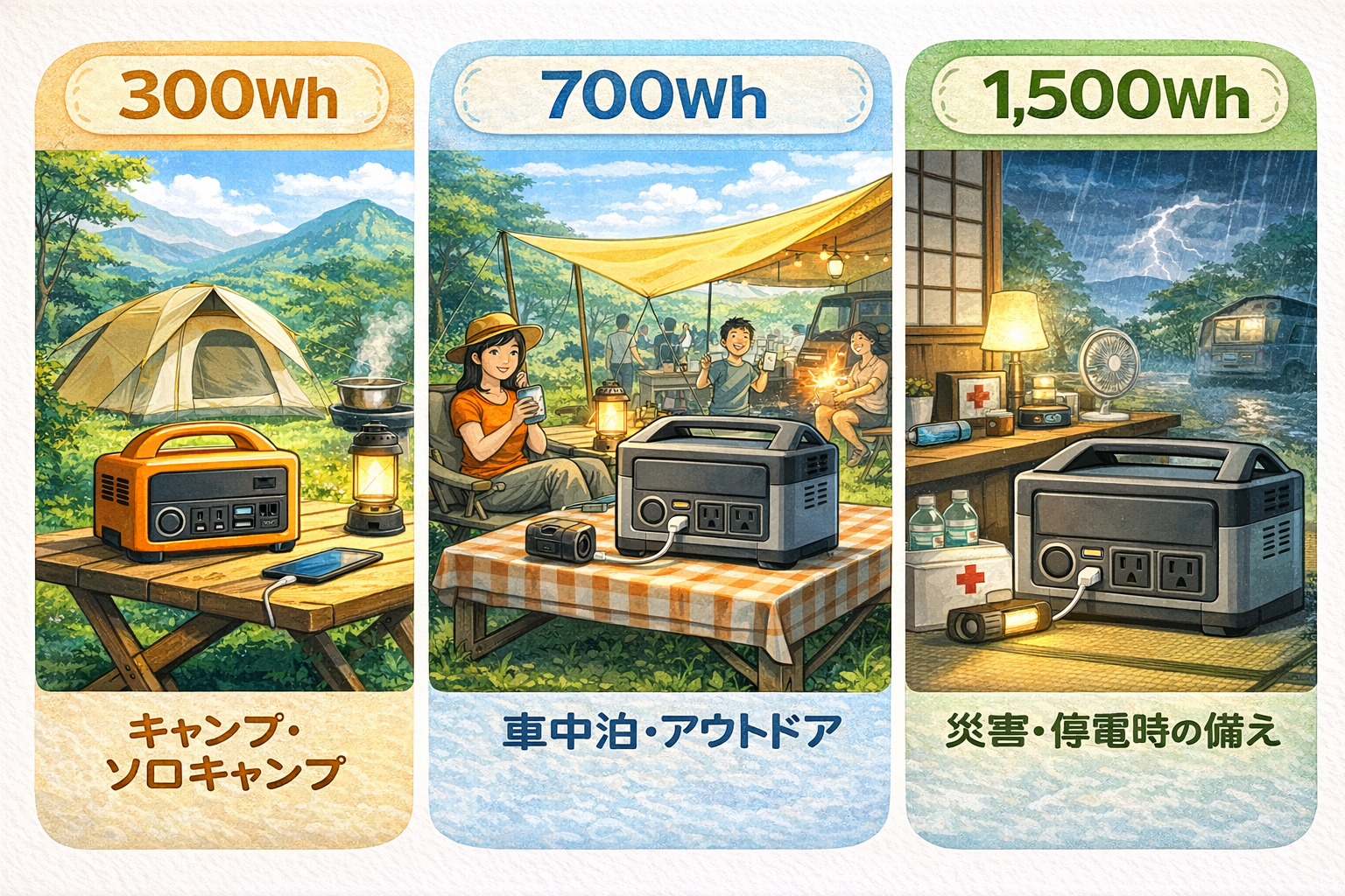 - 用途別の目安:小物充電〜300Wh / キャンプ300〜700Wh / 防災・長期1,000Wh以上